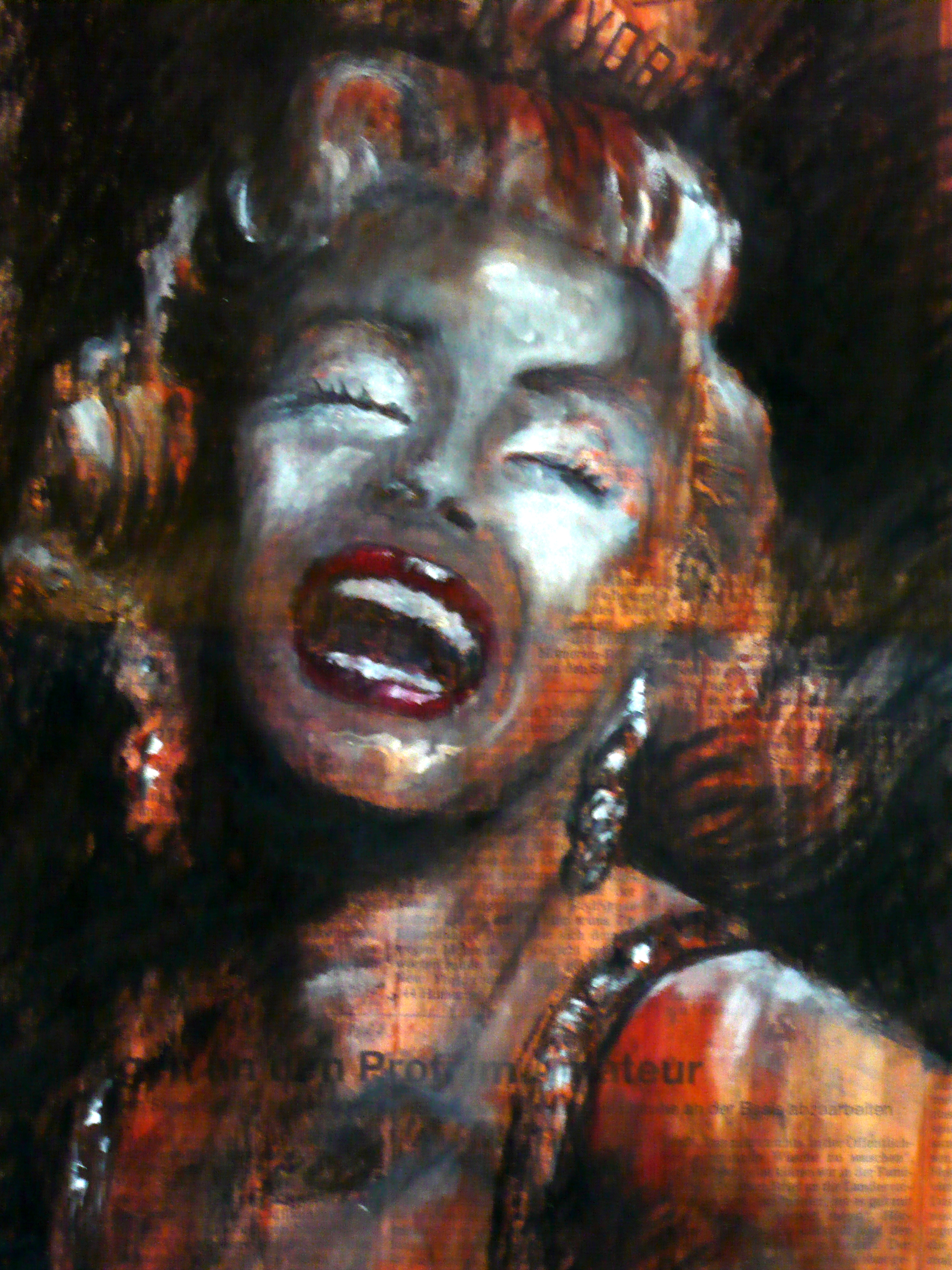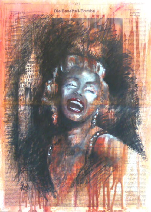 The Baseball Bomb This page from the sport section of a German Newspaper is a piece about Joe Di Maggio who was married to Marilyn Monroe for less than a year. She had such an impact on his life I thought it was fitting to paint her image over the story. Painted straight on the newspaper using Oil, Conte Crayon and Charcoal. If you are interested in purchasing this original art work please contact us on